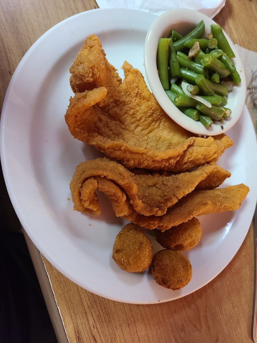 GREAT FOOD....I had the Shrimps with Hushpuppies, Fries and Coleslaw, my husband the catfish with Hushpuppies, Onion rings and Coleslaw. The food tasted fresh and the price two for one, that was a nice surprise to us.The restaurant was not busy, it was Tuesday at about 1 PM, so service was great , fast and friendly.We really enjoyed and we will definitely be back.